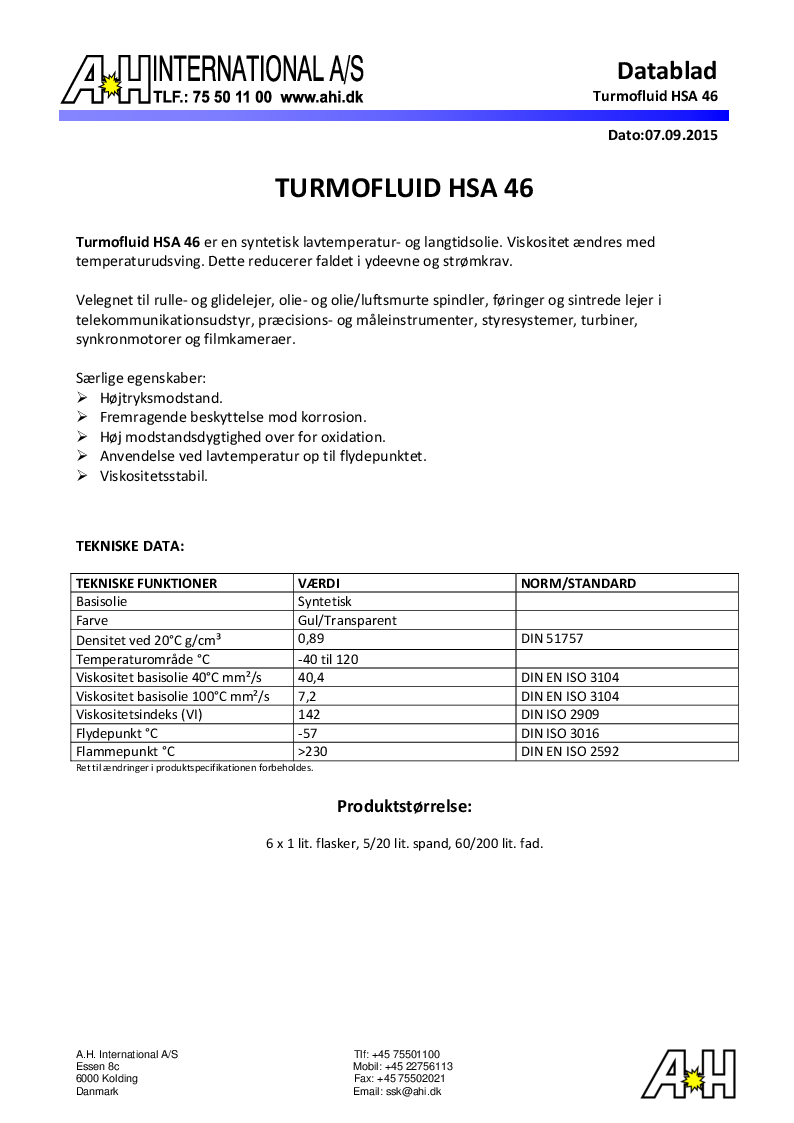 TURMOFLUID HSA 46 er en syntetisk lavtemperatur- og langtidsolie. Viskositet ændres med temperaturudsving. Dette reducerer faldet i ydeevne og strømkrav. Velegnet til rulle- og glidelejer, olie- og olie/luftsmurte spindler, føringer og sintrede lejer i telekommunikationsudstyr, præcisions- og måleinstrumenter, styresystemer, turbiner, synkronmotorer og filmkameraer.